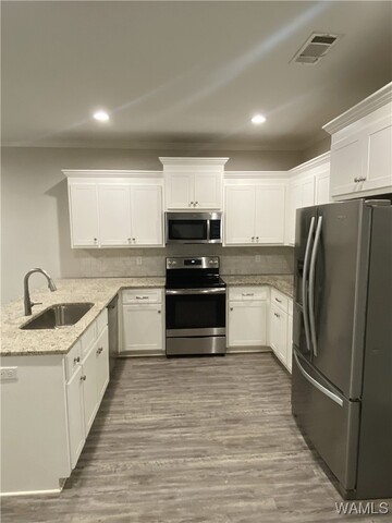 Move-in ready 3BR/2BA home in University Gardens featuring luxury vinyl plank flooring throughout and a bright, open-concept layout. The spacious living area flows seamlessly into the kitchen with custom cabinetry, granite countertops, and modern finishes. The home offers tray ceilings, double granite vanities, a soaking tub, and a large walk-in closet. Additional highlights include tall ceilings, designer selections, Delta fixtures, a tankless water heater, and a covered patio suited for relaxing or entertaining. Conveniently located just minutes from I-20/59, shopping, dining, and The University of Alabama.